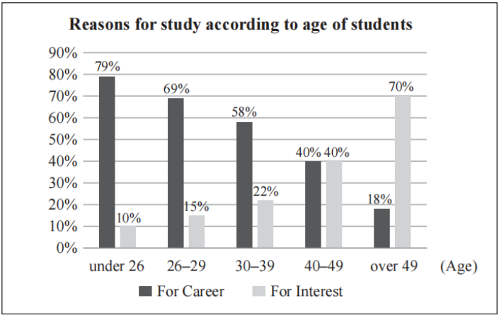 Instructions: Look at the charts below. The first chart shows the main reasons for study among students in different age groups. The second shows the amount of support that the different age groups receive from employers. Write a report (of at least 300 words) to describe the charts, analyze the possible causes reflected within, and make some predictions/suggestions/comments.