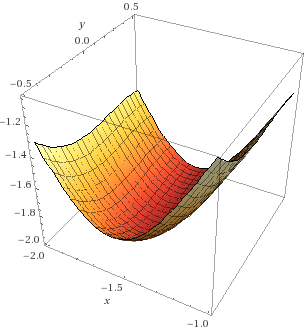 事实上利用 WolframAlpha 可知函数在 x=-1.5708, y=0 附近有一个驻点,再结合图像可知是极小值点. 我们在该点处将函数 Taylor 展开到二次项,得 ,即除了常数项 -2 外是一个正定二次型.