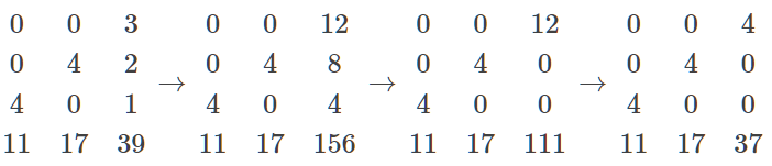 以上例子已经体现了任意线性方程组的求解方法,一般被概括为“遍乘直除法”. 我们的祖先在两千年前就发现了这种方法,而西方直到十七世纪才明确提出类似算法,最终演变为我们即将学习的“高斯消元法”.