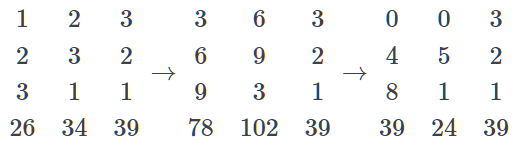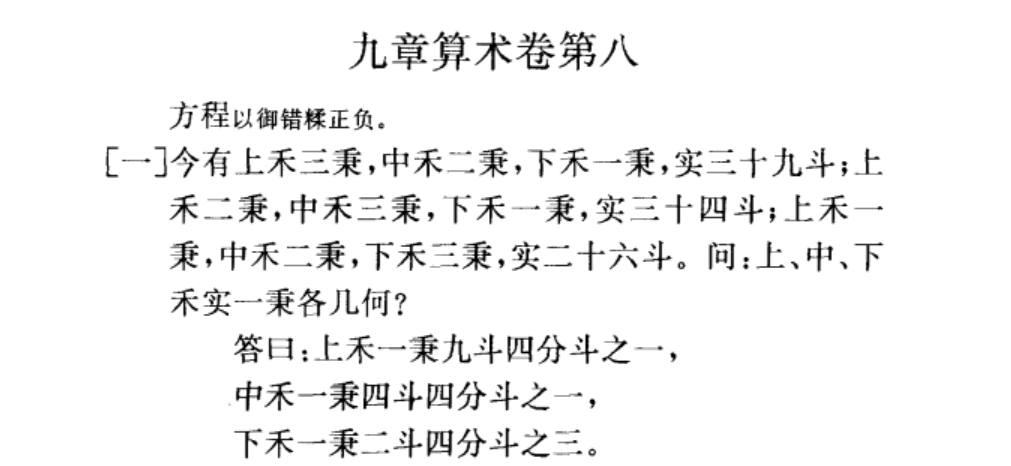 书中解法(术曰):置上禾三秉,中禾二秉,下禾一秉,实三十九斗,于右方。中、左禾列如右方。以右行上禾遍乘中行,而以直除。又乘其次,亦以直除。然以中行中禾不尽者遍乘左行,而以直除。左方下禾不尽者,上为法,下为实。实即下禾之实。求中禾,以法乘中行下实,而除下禾之实。余如中禾秉数而一,即中禾之实。求上禾,亦以法乘右行下实,而除下禾、中禾之实。余如上禾秉数而一,即上禾之实。实皆如法,各得一斗。