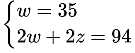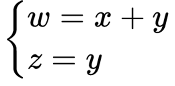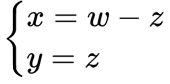 细细体会这个思路,你会发现它把注意力放在了头和脚的关系上. 设有 z 只兔子,砍掉一半兔脚,即 2z 只脚,则鸡和“兔”统一为“一头双脚”动物,不妨设其总头数为 w. 于是有线性方程组 II: