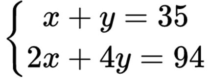 今有雉(鸡)兔同笼,上有三十五头,下有九十四足。问雉、兔各几何?