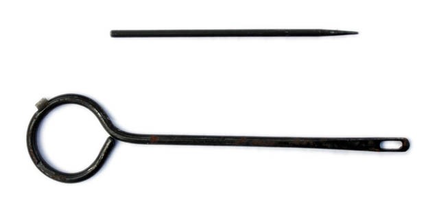 如:七七式手枪的通条(如图2-162)、六四式手枪的通条和尖铳(如图2-163)、九二式手枪的组合式通条(如图2-164)(通条柄下端为一尖铳,可旋转拧入通条体组成通条)、七九式轻型冲锋枪的附件(如图2-166)(包括三段式组合通条、枪管刷头、尖头等)。