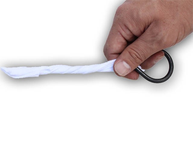 枪管部分:先用枪膛刷刷枪膛,然后用布条配合枪通条擦拭。先在通条孔内穿上长条形的布条,然后将布条均匀地绕缠在通条上(如图2-167),绕缠时应用布条将通条全部包住,且绕缠的厚度不要过大,否则难以通过枪管,但也不能太小,太小则布条不能完全接触枪管内壁,就不能很好地清理凹下的阴膛线内的火药残渣。在擦拭枪管内侧时要尽量由枪管的后端插入枪膛,沿枪膛全长来回擦洗,尽量避免通条体磨擦枪管口,损伤枪口膛线。