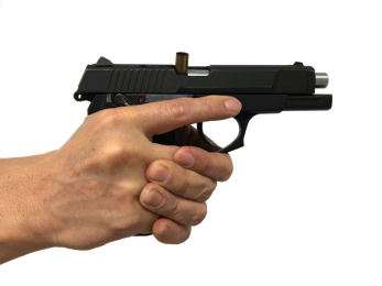 射击时,由于射击者想要追求射击准确性,为了稳定枪支,可能会将枪倚靠在掩体上,但这样做可能会导致枪支故障。如果是半自动手枪的话,将枪侧靠在掩体上,可能会由于套筒在向后运动或复位的过程中由于掩体的阻挡导致上膛不到位或抛壳不畅致使枪支卡壳(如图5-59)。如果是转轮手枪,将枪侧靠在掩体上,会压住转轮,使转轮转动不顺畅,从而加大扣动扳机的力量,加大扣扳机动作对枪支指向的影响,从而影响射击精度。因此在掩体后射击时尽量不要将枪支贴靠在掩体上。