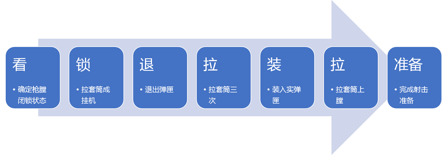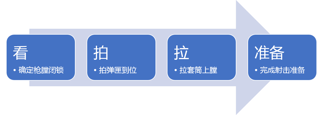 枪膛闭锁类故障可通过“看-拍-拉-准备”的方法进行紧急排障。