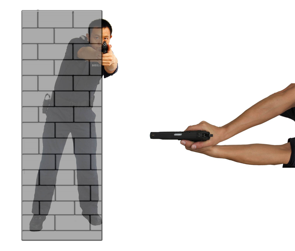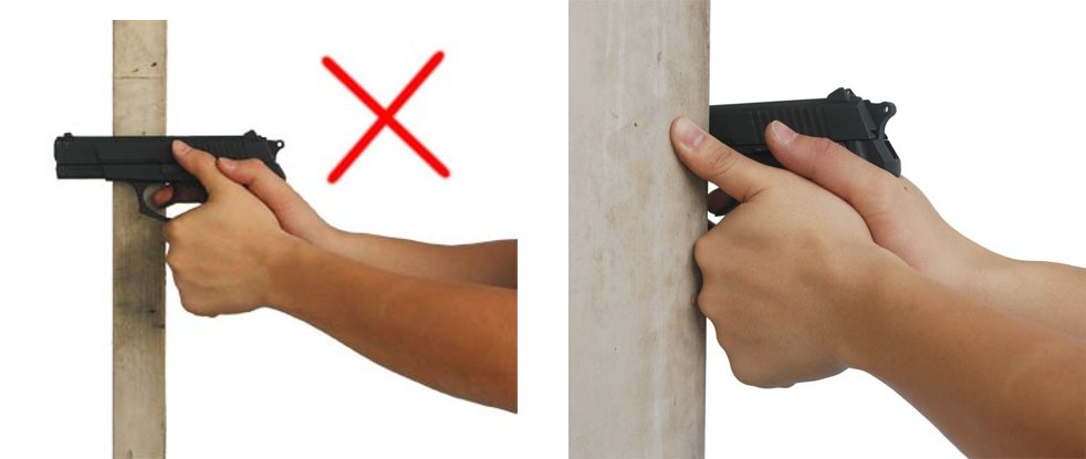 如果对掩体前方的情况不明确时,尽量不要将枪伸出掩体,因为那样可能会导致掩体前方有人靠近抢夺枪支时毫无察觉。而且在周围情况不明,其他方向也存在威胁时,射手枪支位于掩体后方,则应对其他方向上突然出现的危险时,可以以最快的速度将枪转向危险方向,而不会被掩体磕绊。