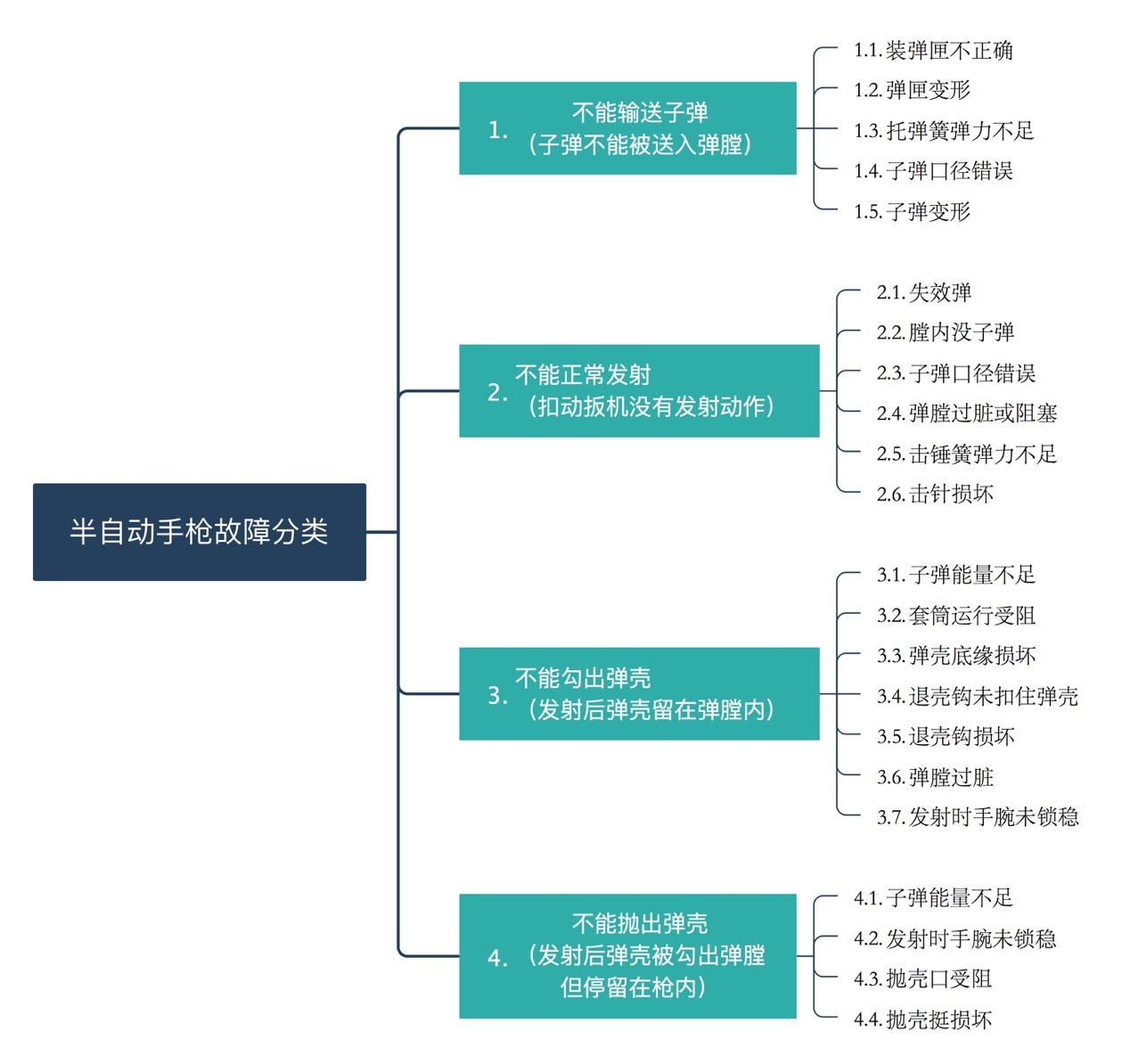 半自动手枪的机械故障一般有四大现象,导致这四种现象出现的原因可能有多种,下表列出这四种现象的常见原因,但不仅限于此列表。