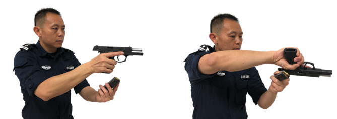 右手按压弹匣卡笋,左手接住退出弹匣夹在中指和无名指之间(见图6-42),或置于持枪右手的小指和无名指之间夹住。