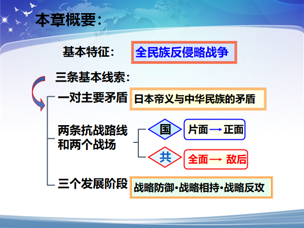 (2)了解中华民族同仇敌忾,奋起抗战的历史过程,明确中国共产党及其领导下的人民革命力量是抗日战争的中流砥柱。