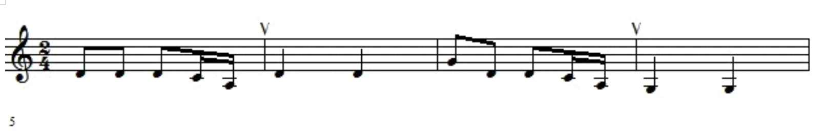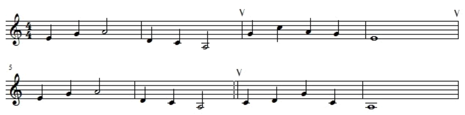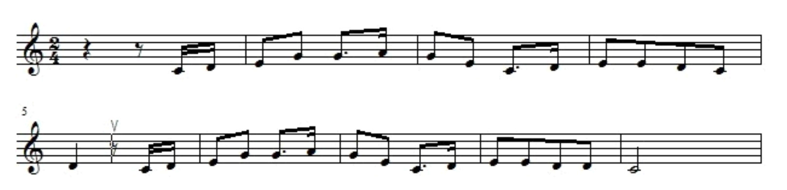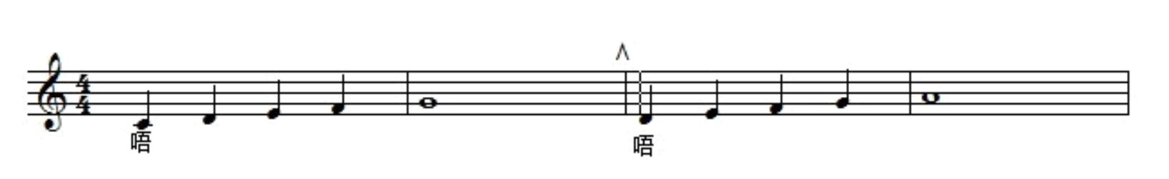 教师可以用“mu”音来练习下图的旋律,两小节一换气,由于其旋律的连贯性,换气速度要快,而吸气之后要保持住两到三个小节,因此呼气就要缓慢。