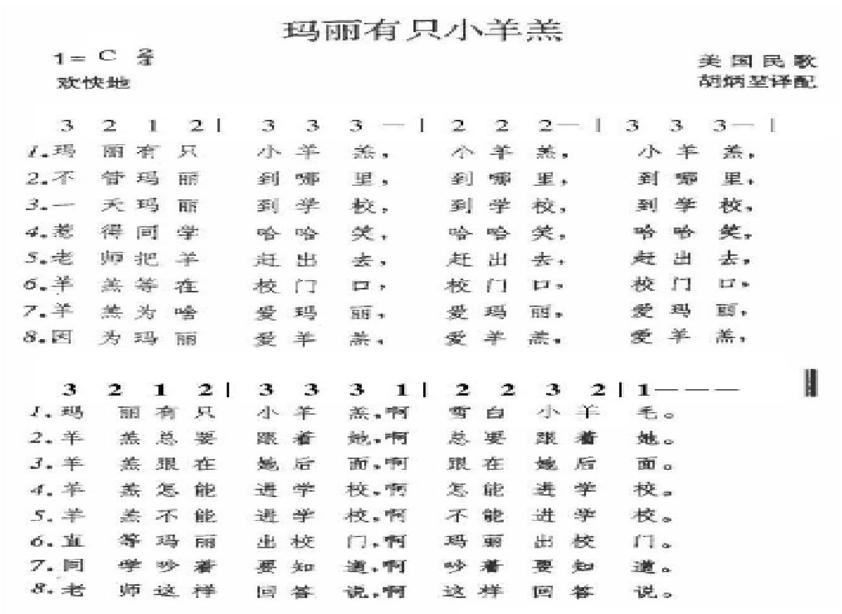 剧本创编完了以后,教师可以让学生们自主的改编歌词,让没一幕的歌词都与其表演内容相很符合。但是坚守的原则是不要变化太多,歌词太多学生会记不住,也容易混淆,从而影响演出效果。如第三幕可以改为“玛丽有只小羊羔,小羊羔,小羊羔,玛丽有只小羊羔,我带它快快跑。