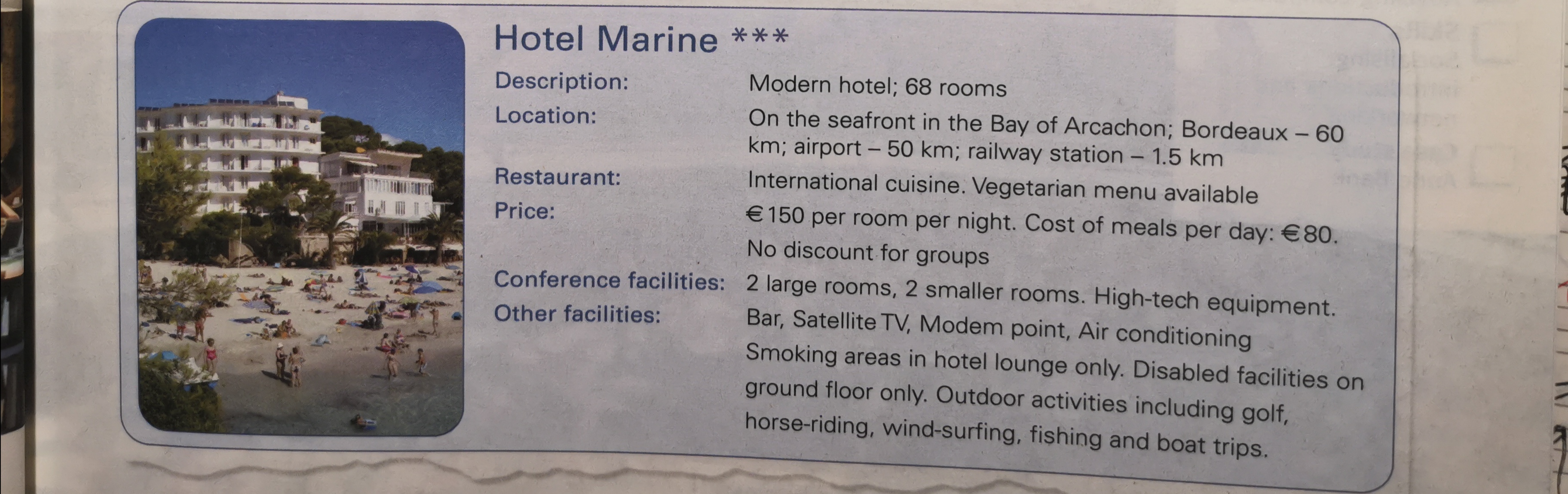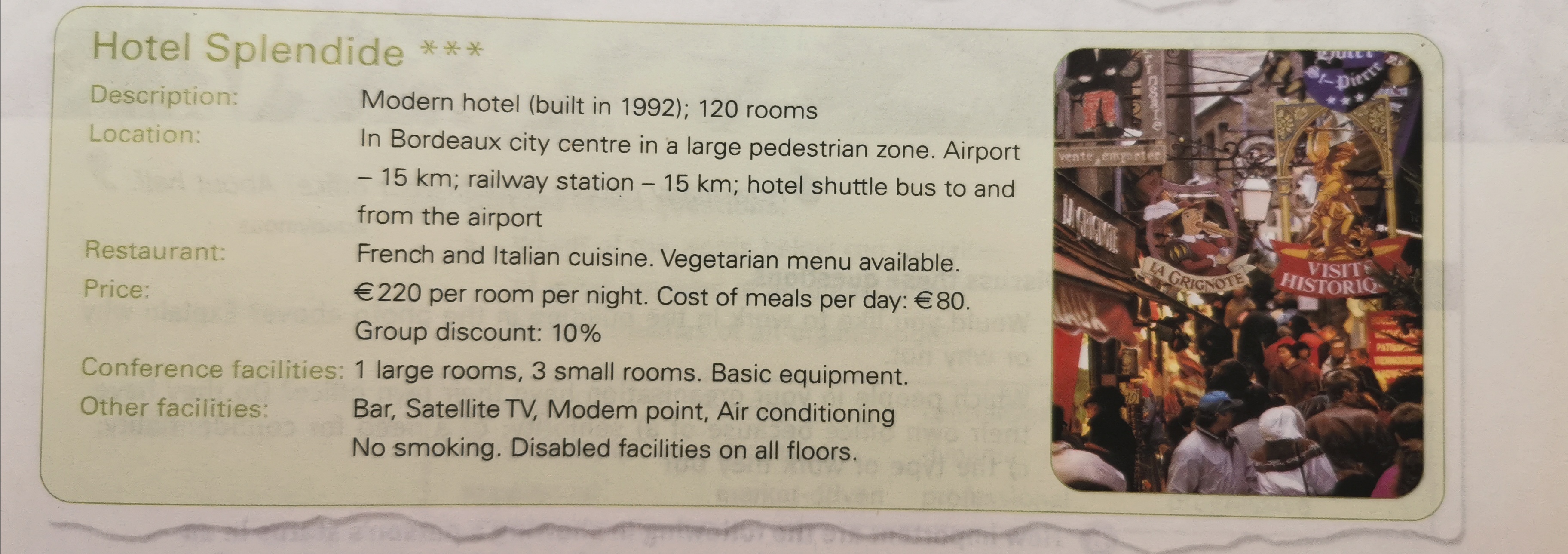 Task (任务):The travel service department of ICON has to choose a great hotel for a seminar held in France. The manager of ICON’s travel service phones the Account managerfor Corporate Travel at Universal Airlines. He asks Universal to propose three hotels in France for the seminar.