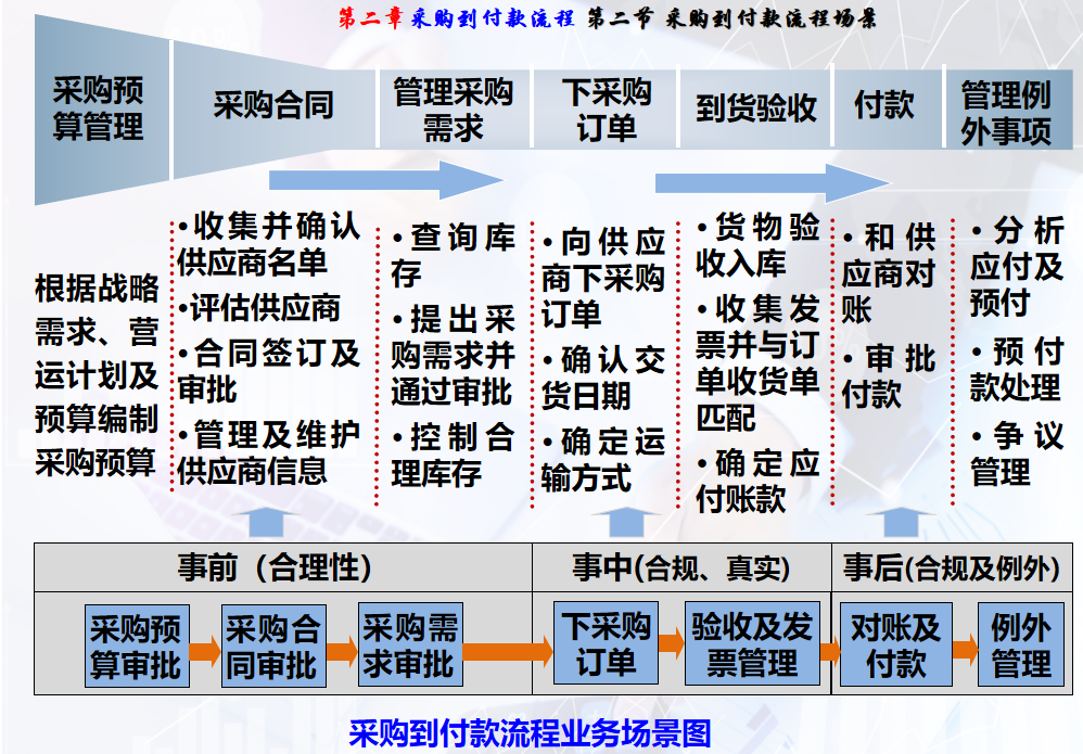 整合了采购系统和应付账款系统,旨在提高流程效率,以全流程活动依次发生的时间逻辑为主线,将有效控制点归集为事前——采购预算、采购合同、采购需求;事中——下采购订单、验收及发票管理;事后——对账及付款、例外管理等7个主要控制环节。