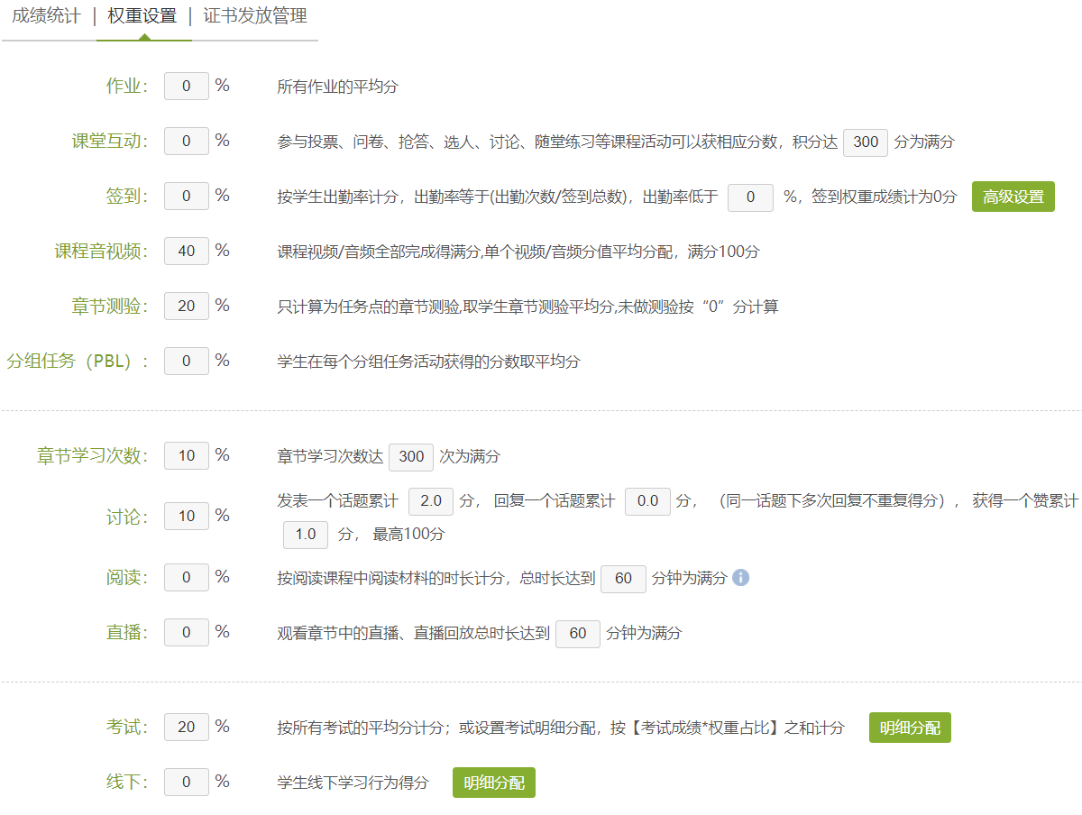 学期总评成绩=学习通成绩*30%+作文/翻译成绩*10%+教师评价10%+期末考试成绩*50%