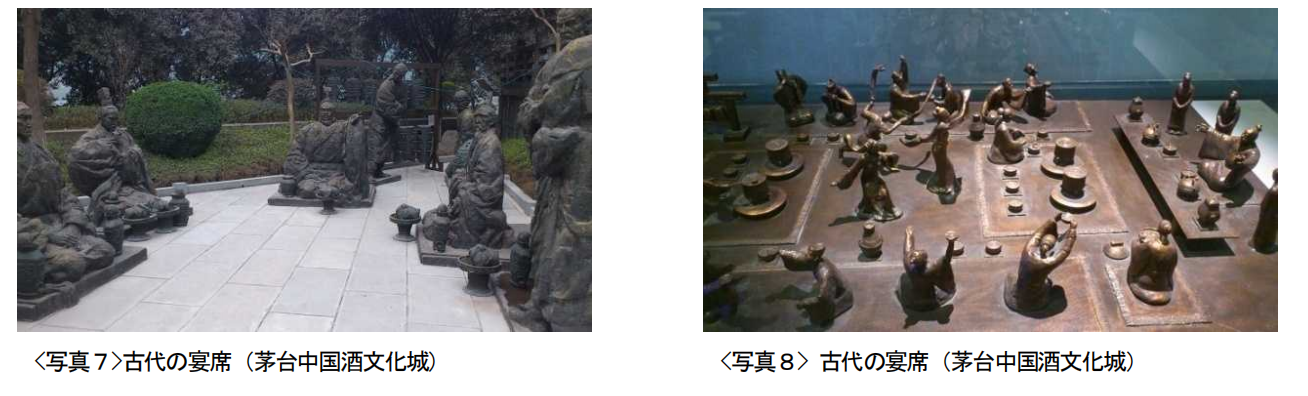 (2)宴会の礼 宴を催すに当たり、席次は十分に重きを置かれ、主人、客人がどの席に座るのか厳格に定められ た。歴史書『史記・項羽本紀』に、席次の尊卑観念が記載されている。東西南北で席次に序列を設 け、地位の最も低い随行者は席に座ることが許されず、そばで宴の世話をする。 また、宴会では身分や年齢を考慮した席次が必須であった。上座は、方位によるものと同様に左 右の区別もあった。歴史書『史記・漢文帝紀』に、右が上座の記載がある。宴会の際、上座の者が 席についてから、その他の者は席につくことができた。 時代の発展とともに建築様式が変化し、これにともなって礼儀作法にも変化が生じるとともに、 人々の日常生活の変化により、新しい宴会のルールが形成されていった。 着席後、主人はまず客人の年配者から若者の順に酒を注ぎ、全ての客人に酒を注いだ後、自分の 杯に注ぐ。酒を飲むことができない主人は、酒を飲める親類、友人を主人のかわりに呼ぶこともで きるし、茶またはその他の飲料を酒の代わりとすることもできるが、いずれにせよ、主人は客人に 対し、自らそのことを説明し、客人の同意を得なければ失礼に当たる。 その後、主人は起立し杯を挙げ、客人に向かって酒を勧め、客人も立ち上がって杯を挙げる。主 人は客人に敬意を表し、まずは自分が先に飲むことを伝え、一気に飲み干した後、酒杯を逆さにし、 一滴も残っていないことを示すことで、誠心誠意に来客をもてなすことを表す。 客人はそれに応え、各自が酒を飲み干した後、主人に敬意を表し、主人に酒を注ぎ、次いで自分 に注ぐ。そして、主人は客人にたくさん飲むことを呼びかけ、また酒を勧める。 この儀礼は、古代から今に至るまで続いている。 同様に、主人のみならず客人による礼儀作法も『礼記』に記されている。例えば、乾杯で杯と杯 をあわせる際、客人の酒杯は主人の酒杯よりも低い位置で、また、目下の酒杯は目上の酒杯よりも 低い位置とすることで、敬意を表すなどである。