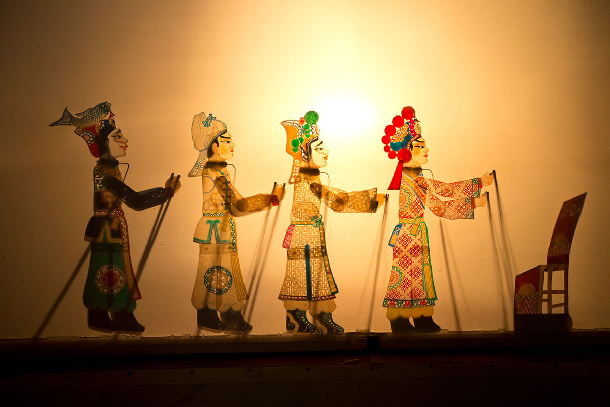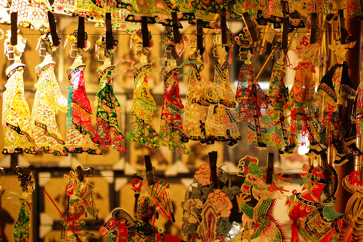 スクリーンは白い布。その布に人形をピタリと当て、上から光を当てます。照明はかつては「油灯」(ランプ、油皿)でした。影絵人形の形は彫刻刀できわめて繊細に裁ち切られ、それに彩色を施して光を当てるとなんとも玄妙な美しさ。人形を操る人のそばでは楽師が胡弓やどらを奏で、甲高い声で歌います。出し物は「西遊記」や「白蛇伝」など神話、伝説の一場面。観客はスクリーンの向こう側から、よく知ったそれらの物語を人形たちがまるで生きているかのように動き演じる様を楽しむのです。