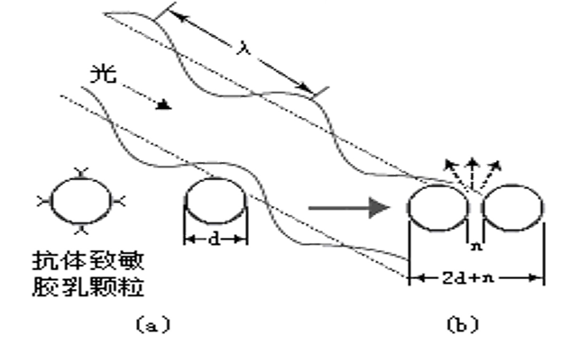(3)胶乳增强免疫浊度测定:为提高反应液浊度,将反应抗体吸附于均已的胶乳颗粒上参与反应,单个胶乳颗粒不阻碍光线透射,但形成免疫复合物后,多个胶乳颗粒聚集,可使透射光减少,减少程度与胶乳颗粒聚集程度成正比,即与待测抗原含量成正比。