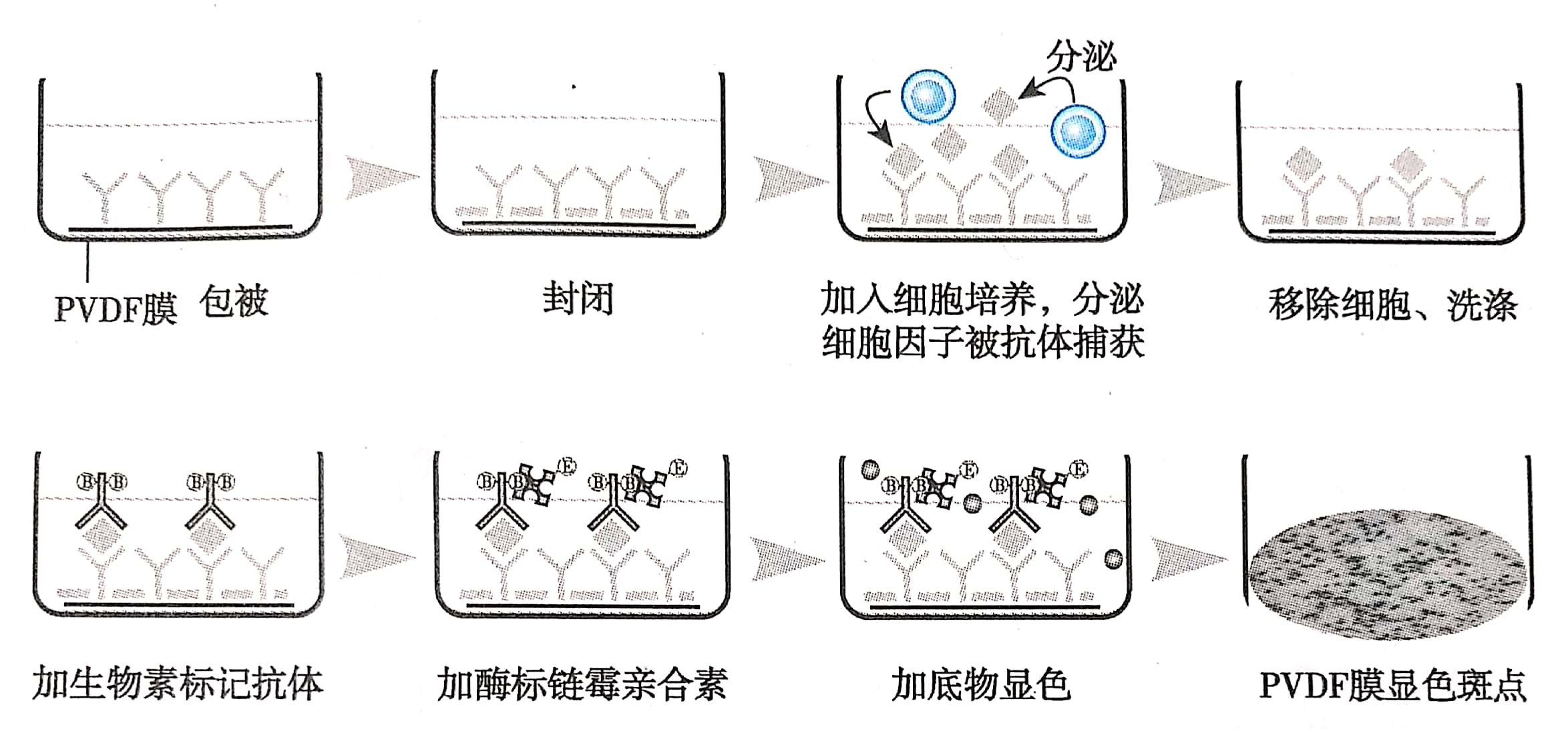 1.基本原理:结合了ELISA技术和细胞培养技术,主要用于细胞因子分泌细胞的定量测定。