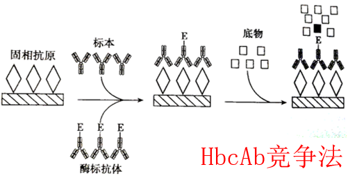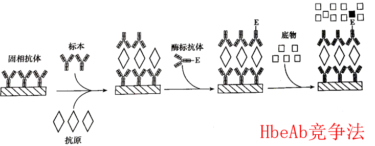 (6)竞争法:通常包被抗原,待测抗体和酶标抗体竞争,显色结果与待测抗体呈负相关;但某些抗原量少或不稳定,则无法包被,因此只能包被抗体,检测时再加入抗原,由固相抗体与待测抗体竞争,再加入酶标抗体,虽然多一步“中和抗原”过程,但结果判定方法与前者相同。