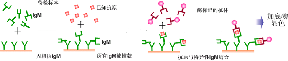 (7)捕获法:用于检测特异性IgM,由于血清中IgM量远远低于IgG含量,为防止IgG干扰,先利用固相抗IgM抗体,捕获待测总IgM,再利用特异性抗原,检测出特异性IgM。