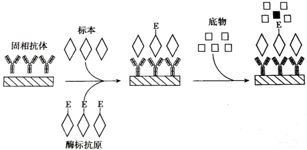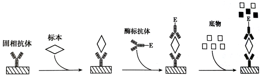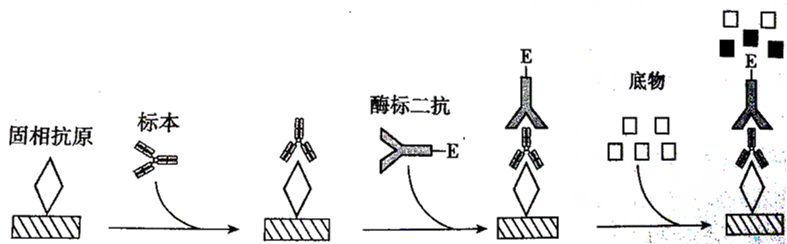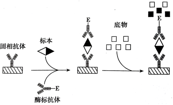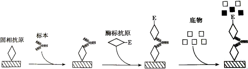 (1)双抗体夹心法:待测抗原上至少有两个以上表位,且表位相同,即两抗体相同。为避免相互干扰,待测抗原和酶标抗体分开加,需要两步温育和洗涤。
