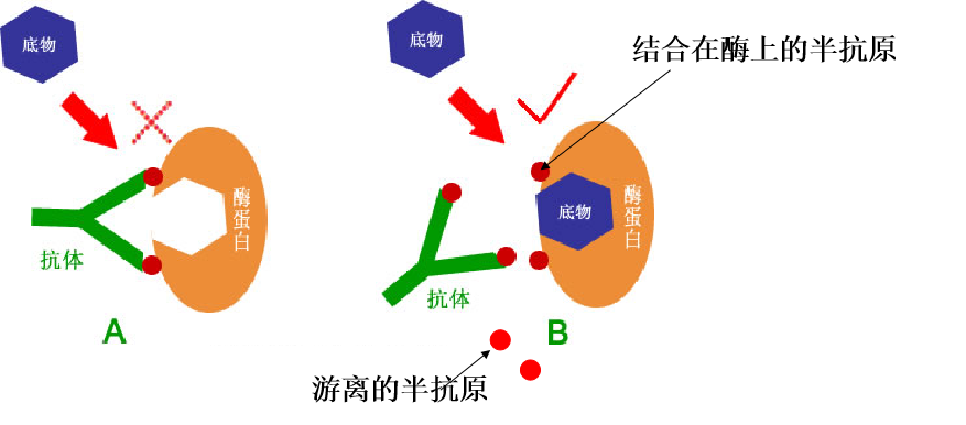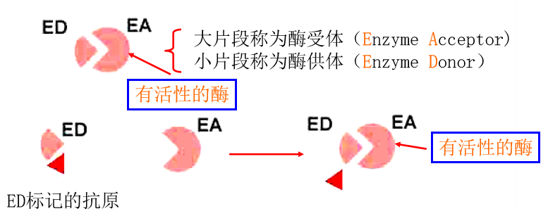1.基本原理:利用抗原抗体结合后导致酶活性改变,可在不分离的情况下,检测待测物含量,呈正相关。
