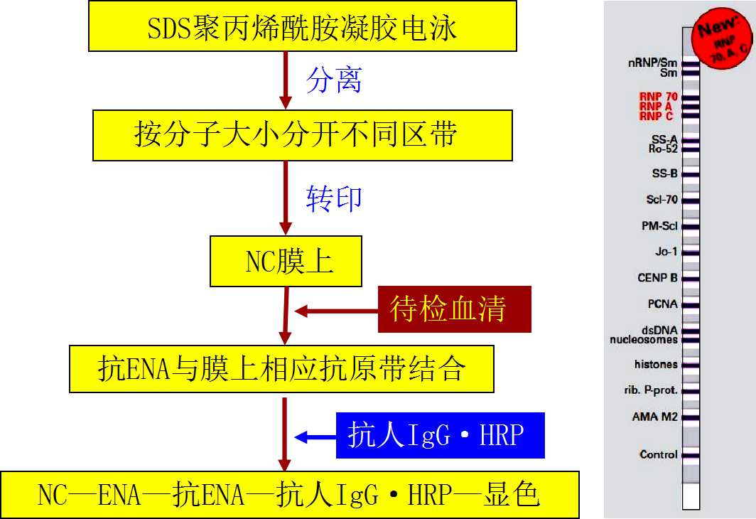 ②抗ENA抗体检测:免疫印迹试验(IBT),是ANA检测最主要的确证试验。