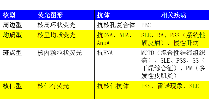 ①ANA类型:抗DNA抗体、抗组蛋白抗体、抗非组蛋白抗体和抗核仁抗体。