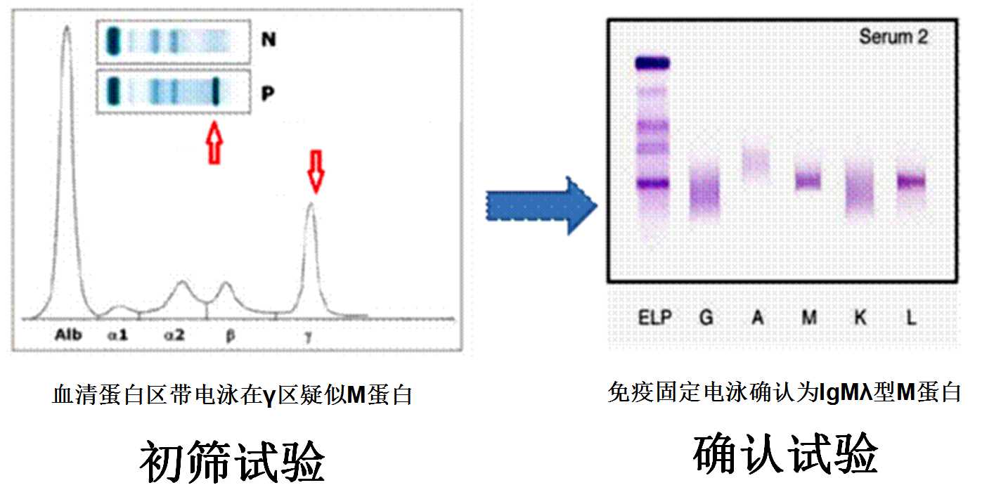 (2)确证试验:①免疫电泳检测;②免疫固定电泳检测;③免疫球蛋白亚型定量检测。