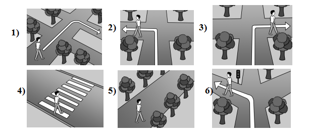 阅读关于问路的对话,按照对话所指路线选择三幅图片并排序。