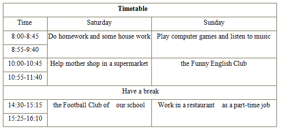 This is my weekend plan. I ___________________do my homework in the morning. I’m going to do some housework work. From 10 o’clock in the morning, I am going to __________________. In the afternoon, I __________ to the football club of our school. I am going to _____________ and listen to some music on Sunday morning. Then I’m going to the Funny English club. On Sunday afternoon, I ________________.