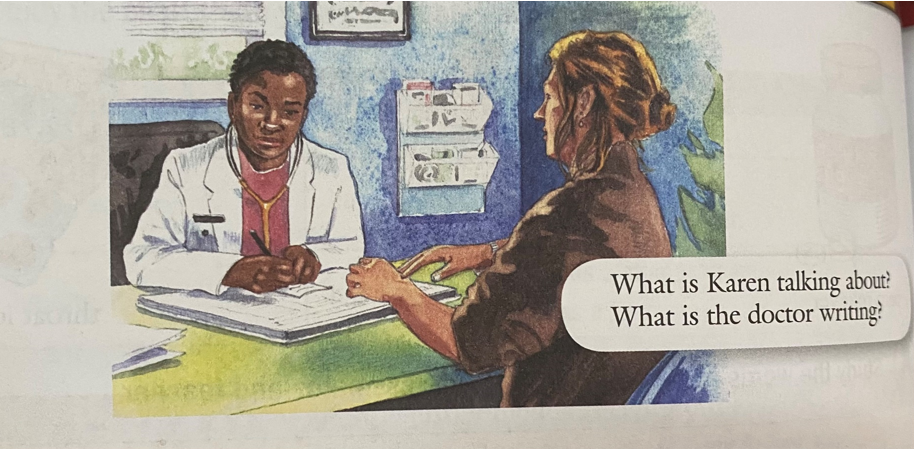 Karenis talking to the doctor. She is sick. Karen has a bad headache and sorethroat, the doctor is gibing Karen a presceiption for some medicine. She needsto read the labels on the nedicine carefully . The doctor is helping herunderstand them.