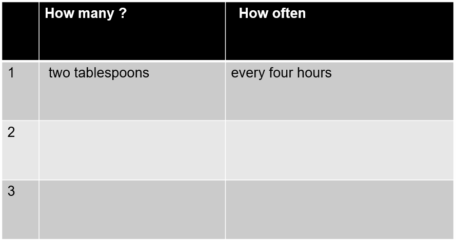 Thisone says to take two tablespoons every four hours. Let me see, tht means Ishould take one when i wake up aroud 8:00 and then at noon and again at 4;00.I will take the last tablespoon at 8:00.