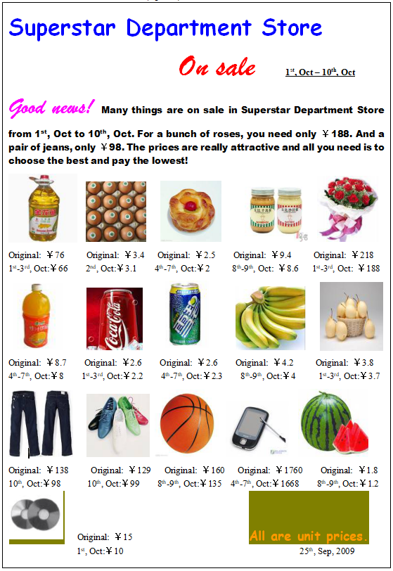 ( ) 1) Salad sauce is on sale on 9th, Oct.