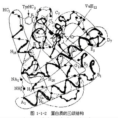 (II) 蛋白质的三级结构。指在二级结构的基础上,再由氨基酸侧链之间通过形成氢键、疏水键、二硫键等再度折迭、盘曲,形成复杂的空间结构(图1-1-2)。几乎所有具有重要生物学功能的蛋白质都有严格的特定的三级结构。