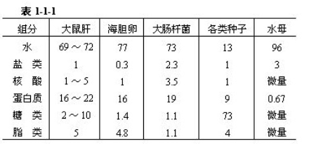 不同细胞或不同生物中,各种化合物的含量有一定的差异,如表1-1-1