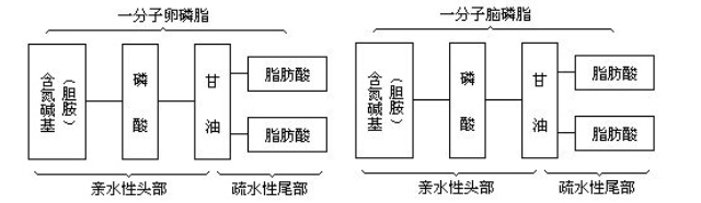 磷脂中的磷酸氮碱部分易与水相吸,构成磷脂分子的亲水性头部;而来自脂肪酸的碳氢链部分,不与水相吸,构成疏水性尾部。在参与膜的结构时,磷脂分子排列成双分子层,亲水性头部朝外,疏水性尾部相对,朝向内侧。