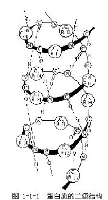 (I) 蛋白质的二级结构。指蛋白质分子中多肽链本身的折迭方式。据实验证明,二级结构中主要是α-螺旋结构和β-折迭片层结构。此结构中有氢键参加,以维持其稳定性(图1-1-1)。