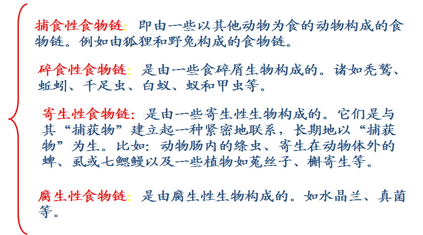食物链:生态系统中,由食物关系把多种生物联接起来,一种生物以另一种生物为食,另一种生物再以第三种生物为食,……彼此形成一个以食物联接起来的链锁关系,称为食物链。