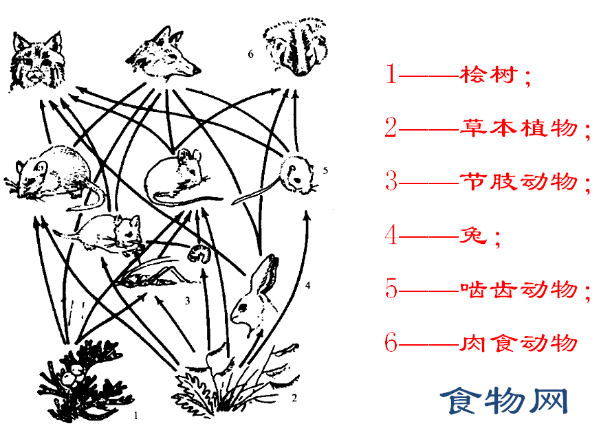食物网:在一个生态系统中,食物关系往往复杂,各种食物链相互交错,形成所谓食物网。能量的流动,物质的迁移和转化,就是通过食物链或食物网进行的。见下图: