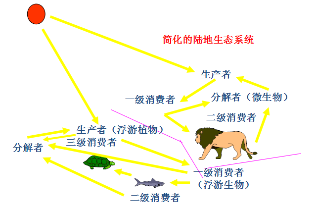 消费者:主要是动物,又分为一级消费者(如草食性动物);二级消费者(如肉食动物);……等等。