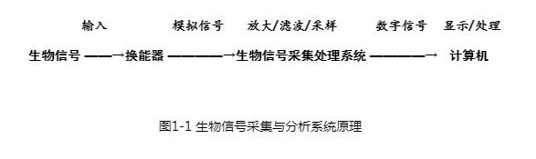 生物信号采集分析处理系统的基本原理是将从生物体采集的生物信号,进行放大、滤波等处理,然后对处理的信号通过模/数转换,并将数字化后的生物信号传输到计算机系统,计算机则通过专用的实验系统软件接收数字信号,然后对这些收到的信号进行实时处理、显示。另外,生物信号采集处理系统软件也可接受指令发出电刺激信号(图1-1)。
