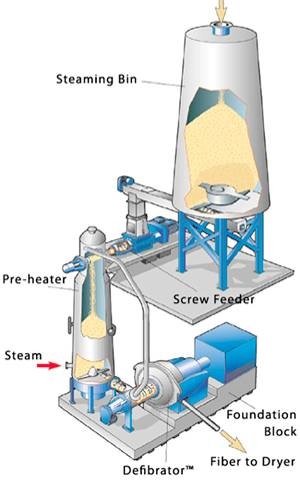 加热机械法是将原料用饱和蒸汽进行汽蒸,使木材细胞胞间层与细胞壁的木质素部分溶解或软化,降低纤维之间的结合强度,然后在常压或高压条件下,经机械外力的作用使其分离成纤维。由于对原料进行了预处理,降低了纤维分离时的能耗,得到的纤维形态完整、柔韧性好,纤维得率也比较高。