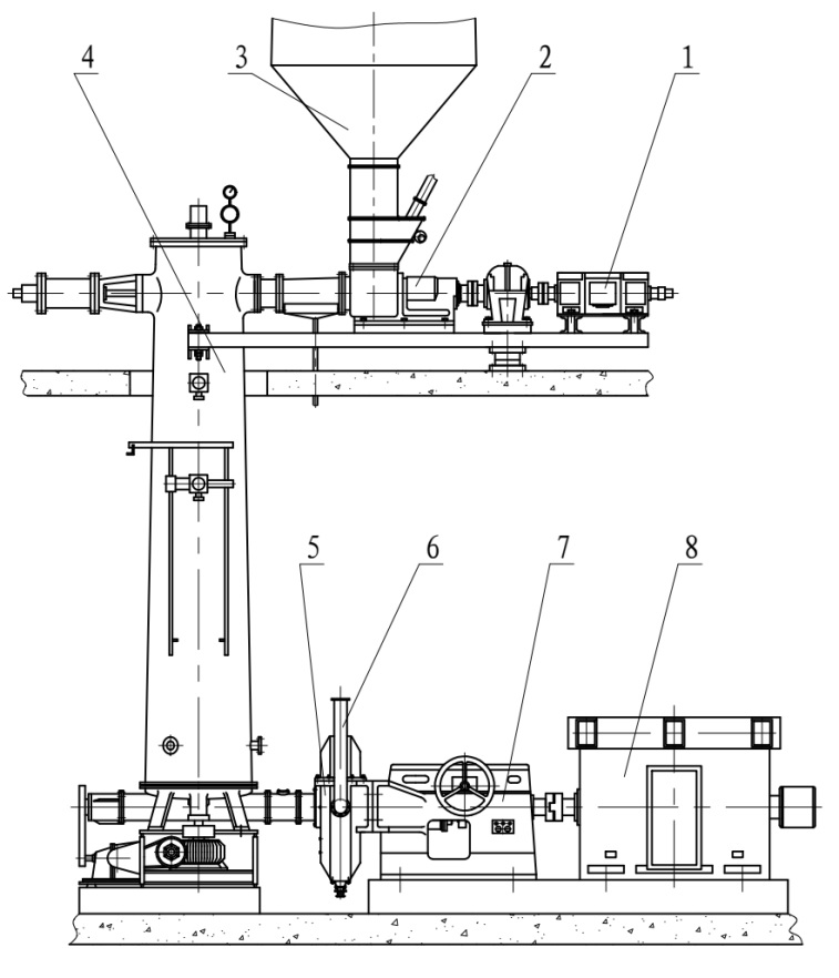 1.进料电机;2.进料装置;3.料仓;4.预热蒸煮装置;5.研磨装置;6.排料管;7.传动与控制机构;8.主电机