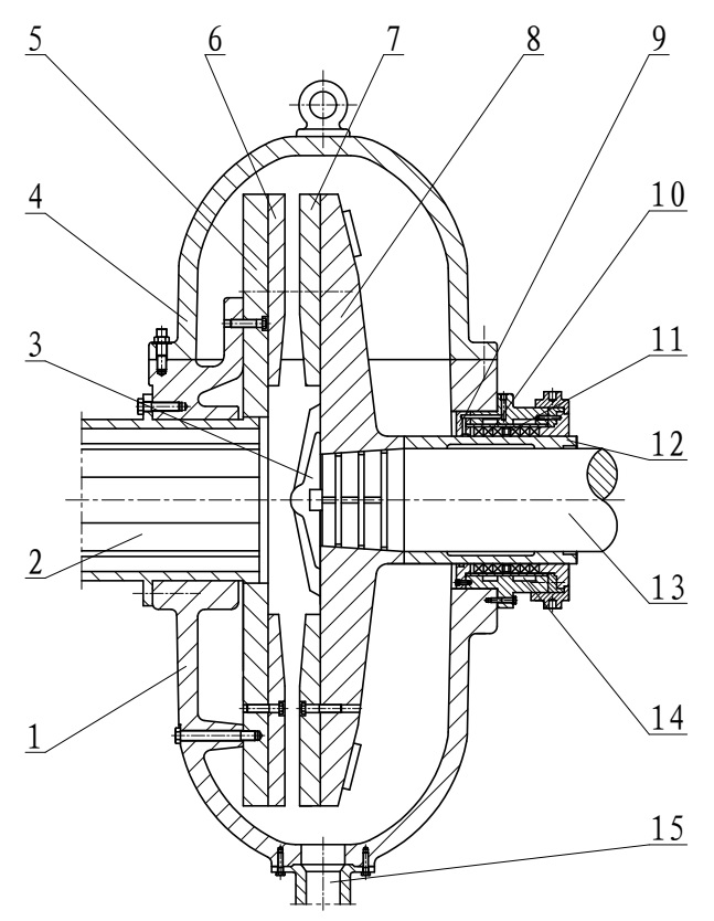 9.前高压密封环;10.盘根;11.后高压密封环;12.轴套;13.主轴;14.冷却水环;15.排污口