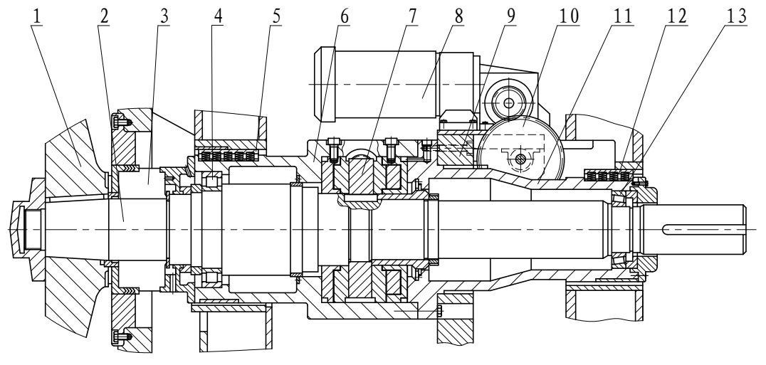 1.磨盘;2.主轴;3.机械密封装置;4.圆柱滚子轴承;5、12.导向键;6、11.主轴壳体;7.液压推力轴承;