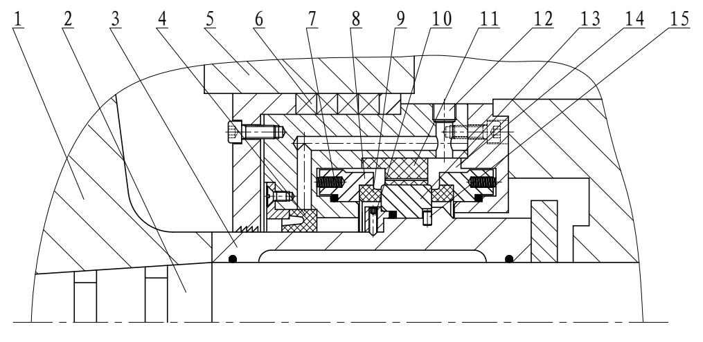 工作中动环13与静环9之间会形成摩擦,因此动环、静环材料应软、硬搭配。静环属于软环,现在一般采用碳石墨、硅化石墨、碳-碳复合材料等制成;动环属于硬环,一般采用碳化硅、碳化铬等制成。