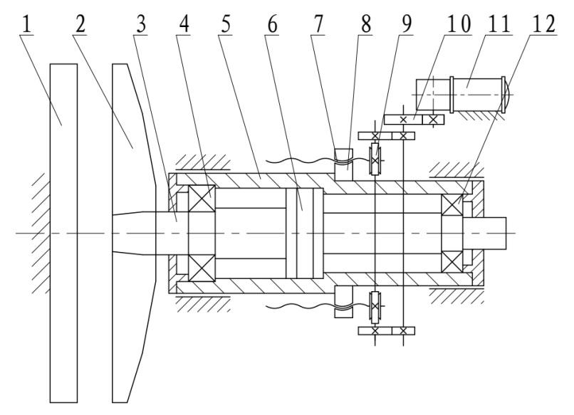 9.蜗轮蜗杆副;10.齿轮副;11.伺服电机;12.后轴承