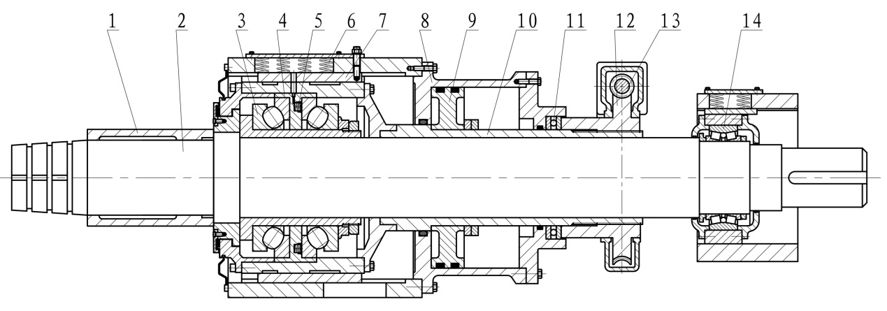 1、10.轴套;2.主轴;3.推力向心轴承;4.轴承壳体;5、6.弹簧;7.导向键;8.加压油缸;9.活塞;
